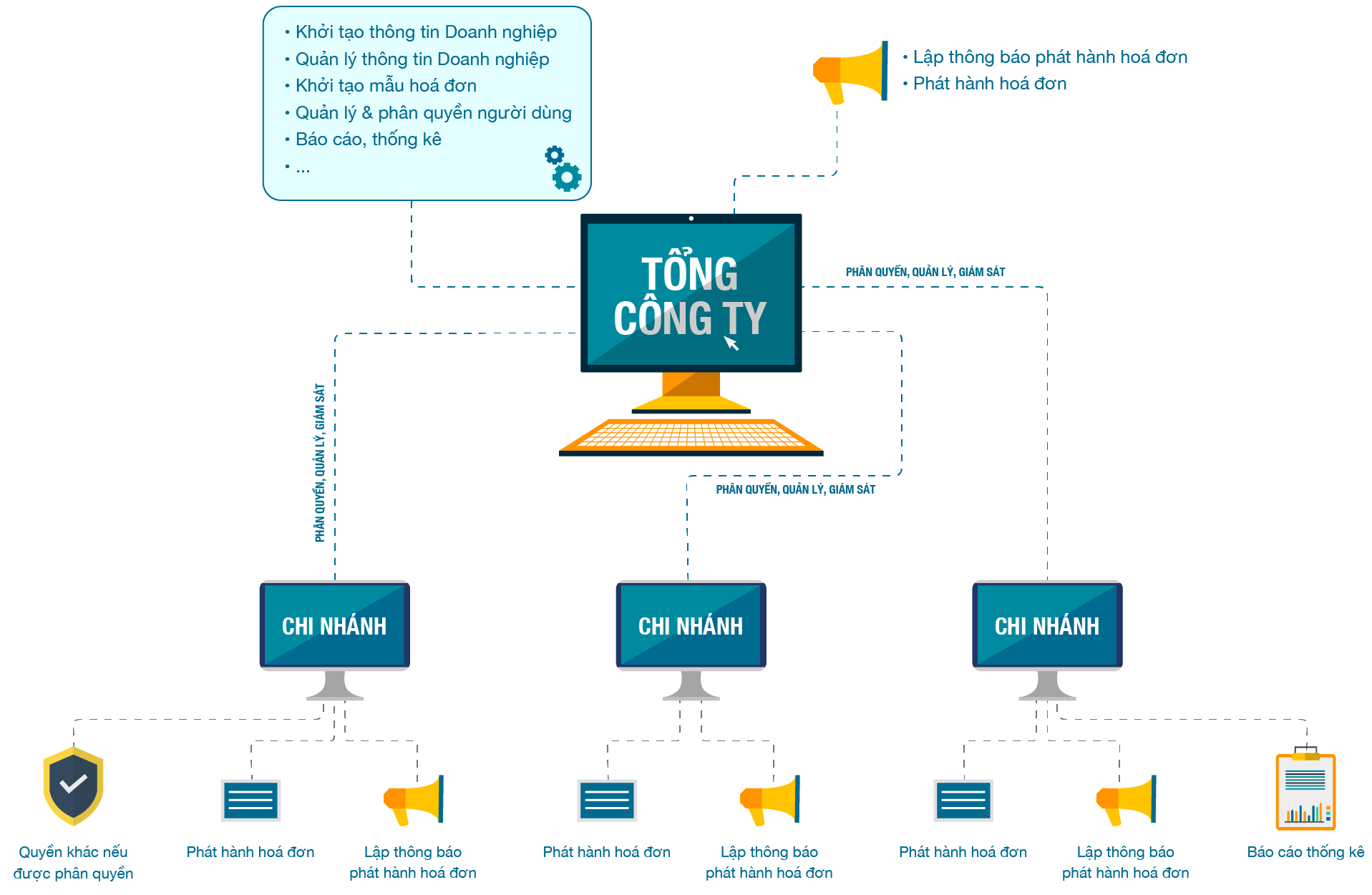 - Đơn vị quản lý có thể quản lý tâp trung hoạt động động sử dụng hóa đơn của tất cả các chi nhánh
